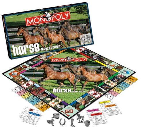 Love horses? Then this classic game with a twist is for you. The customized Monopoly Game features photographs of different breeds of horses. Includes six collectible equestrian-themed pewter tokens - Horse Trailer, Saddle, Riding Boot, Horseshoe, Bale of Hay, Horse. For two to six players.